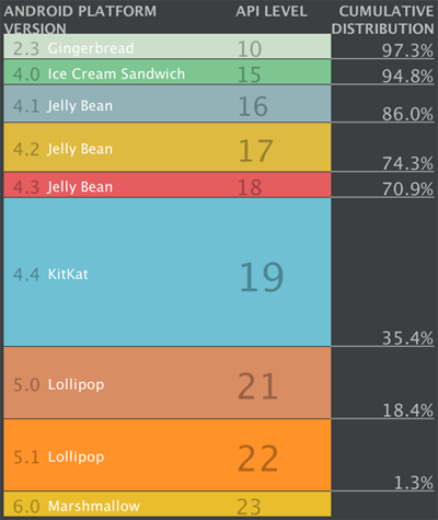 随着厂商的版本迭代, 超过三分之一的手机都是5.0以上的操作系统, 随着更多便宜的低端手机普及5.0+系统(如红米系列), 给用户带来更好的体验, 会大大增加应用留存率.